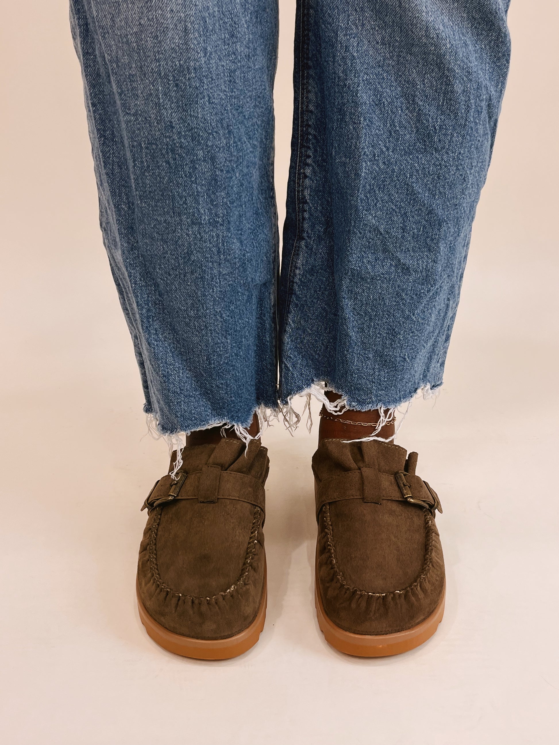 A chic twist on everyday comfort. These semi-platform mules combine the ease of a slip-on with modern, elevated details. Designed with a buckled strap, soft fringe along the entrance, and delicate rippled stitching across the vamp, they bring a unique and refined look to any outfit.