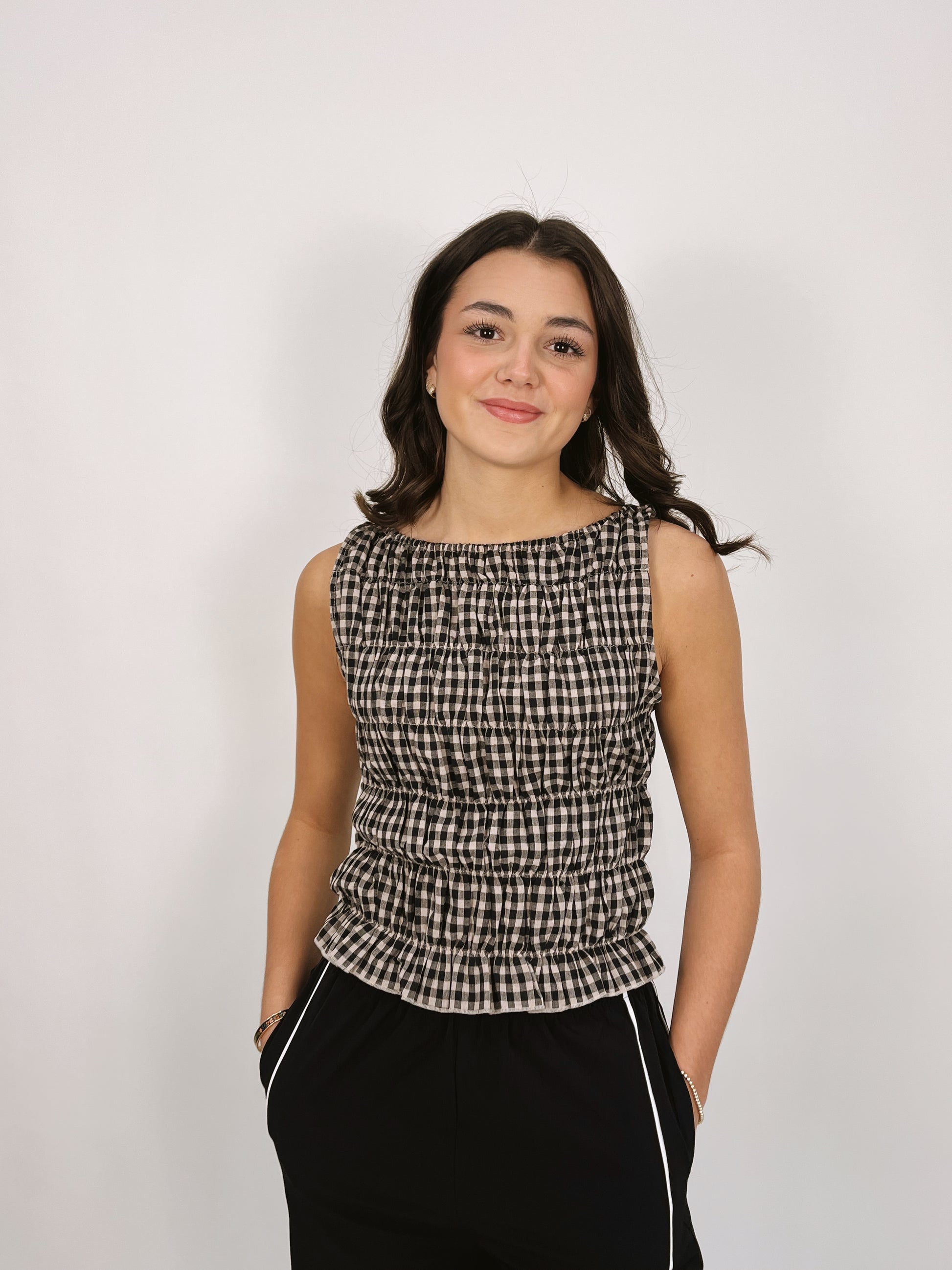 A feminine, easy-to-wear staple featuring an all-over smocked fit and classic gingham print. Designed with a boat neckline and sleeveless cut, the Zoe Top offers a flattering, comfortable silhouette that pairs effortlessly with denim, skirts, or your favorite everyday bottoms.